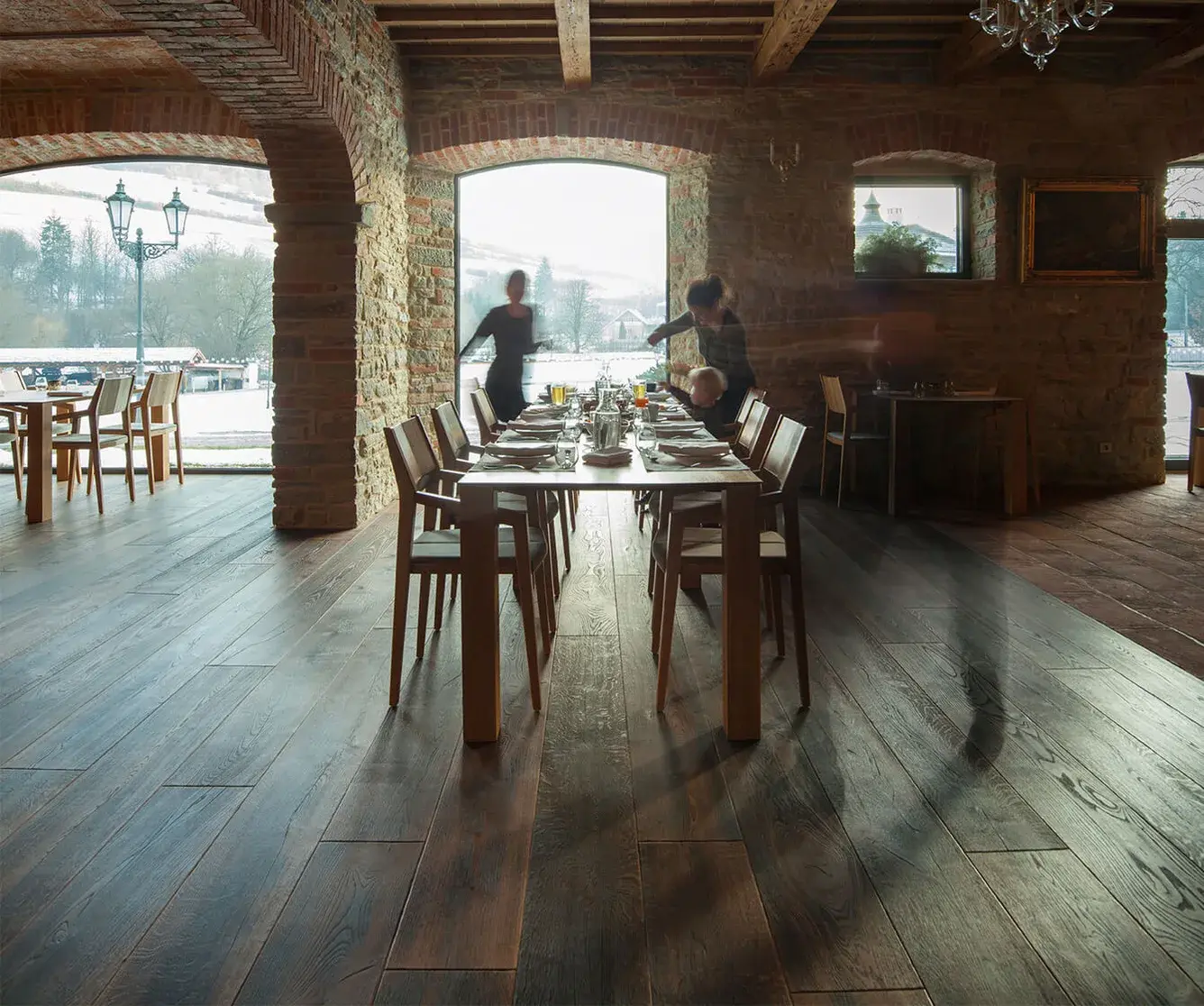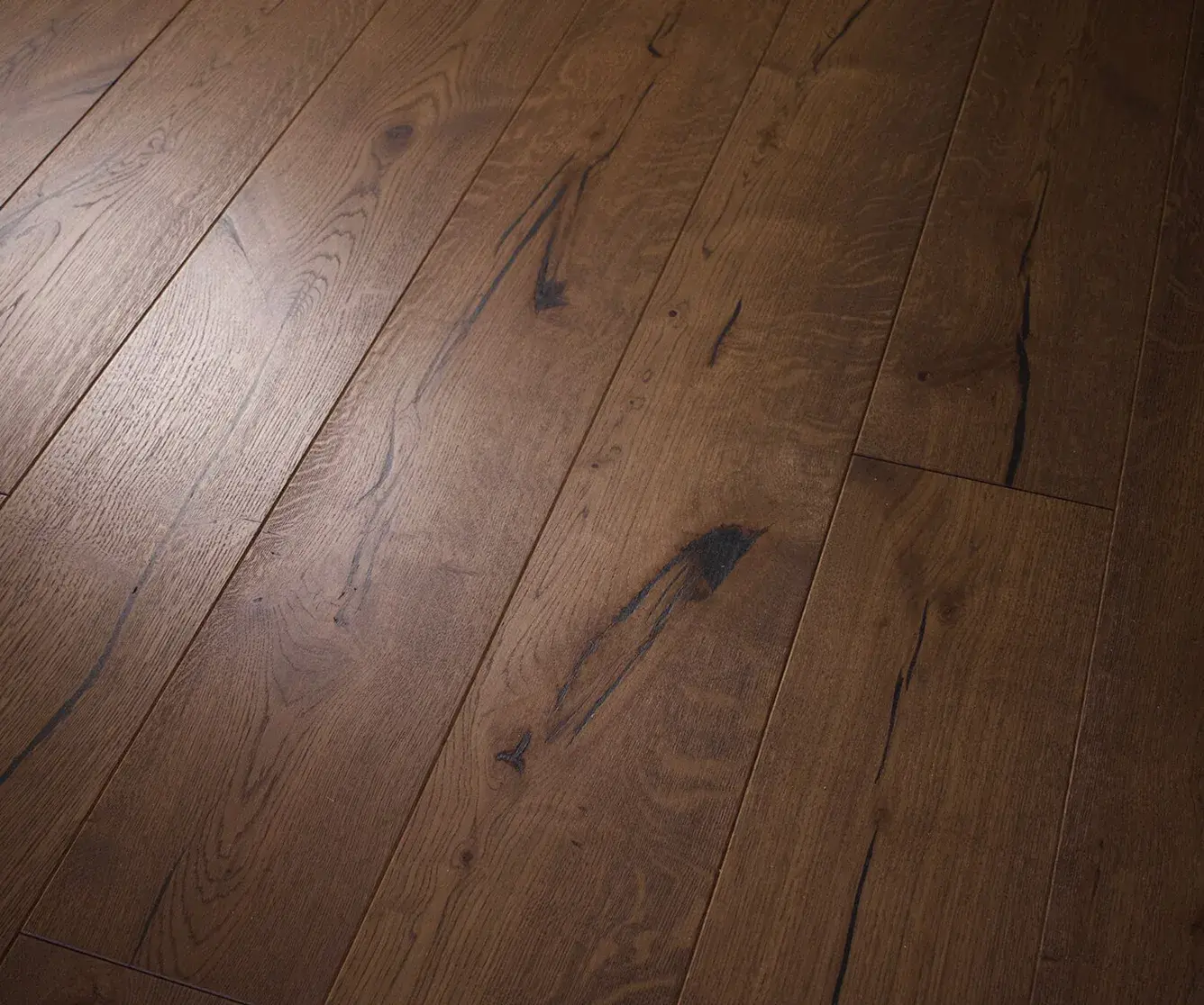 KOLEKCE HAZEL vzdává hold starobylé tradici dubového dřeva, materiálu vysoko ceněného pro svou vznešenost a pohodlí. Tradiční barvou hnědého dřeva tato kolekce evokuje úctu a vytváří pevný základ v jakémkoli prostoru. Tmavé podlahy kolekce HAZEL dokonale ladí s moderním nábytkem a jemnými texturami, čímž jsou vynikající volbou pro kanceláře, dílny a interiéry obývané uznávanými profesionály a zralými osobnostmi. Olej s hnědým pigmentem použitý v této kolekci zdůrazňuje kresbu dřeva a dodává tradiční vzhled zralého dubu s charismatickou patinou. Přírodní oleje pronikají do dřeva a chrání povrch dřeva, aniž by potlačovaly jeho přirozený vzhled. To číní kolekci HAZEL skvělou volbou pro komerční prostory a místa s vysokou zátěží nebo zvýšeným provozem.